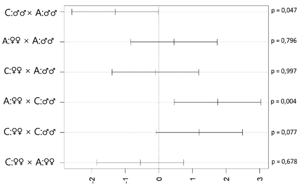 Visualisation Tukey’s post hoc tests of consummation of painted common rough woodlice (Porcellio scaber) by males and females of Italian wall lizard (Podarcis siculus). The mean difference between means of both categories with 95% CI and p-values are presented. Treatment of prey: A – aposematic, C – cryptic.